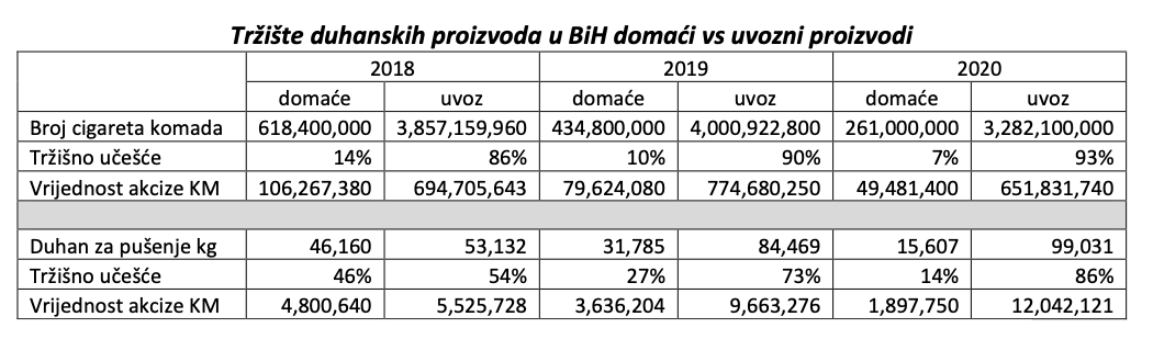 Analizom 12-godišnjega razdoblja vidljiv je drastičan pad legalne prodaje cigareta na nacionalnom tržištu Bosne i