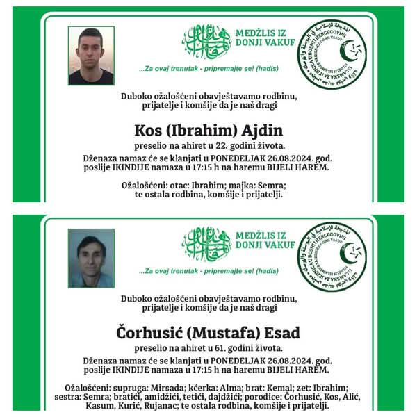 Na haremu “Bijeli Harem” sutra 26. augusta, poslije ikindije namaza (17:15h) klanjat će se dženaza
