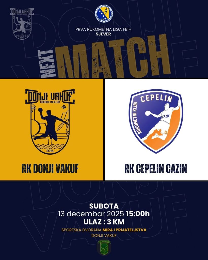 U okviru 11. kola Prve rukometne lige Federacije BiH – Grupa Sjever donjovakufski rukometaši ove subote, 13. decembra od 15 sati u Sportskoj dvorani Donji Vakuf ugostit će ekipu RK”Cepelin” Cazin.