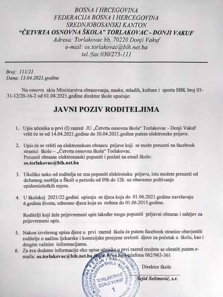 Četvrta OŠ Torlakovac / Poziv roditeljima za upis prvačića