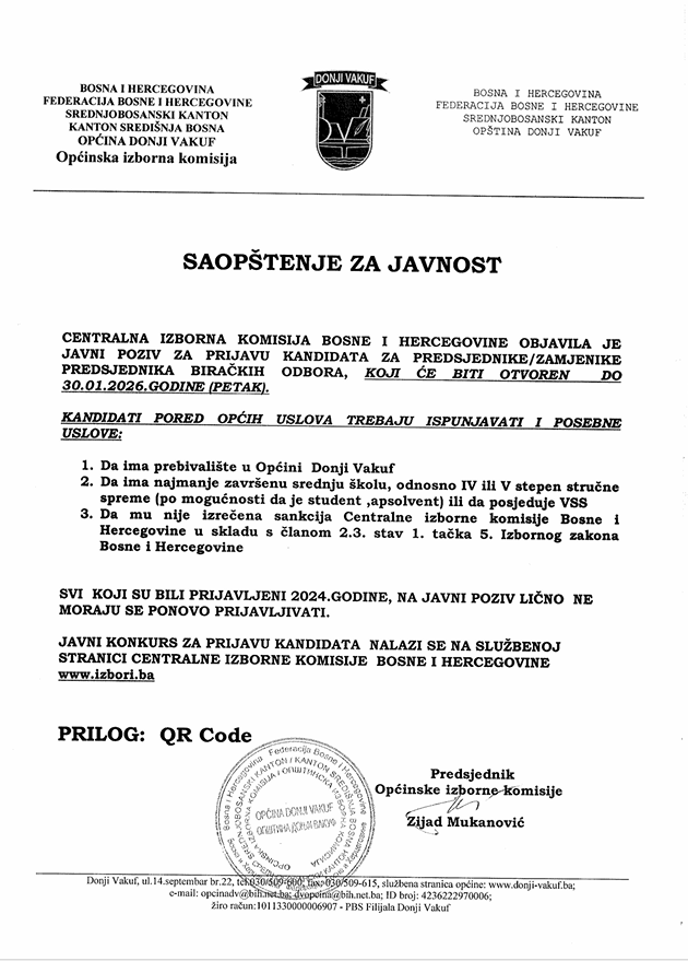 CIK BIH -Javni poziv za prijavu kandidata za predsjednike/zamjenike predsjednika Biračkih odbora