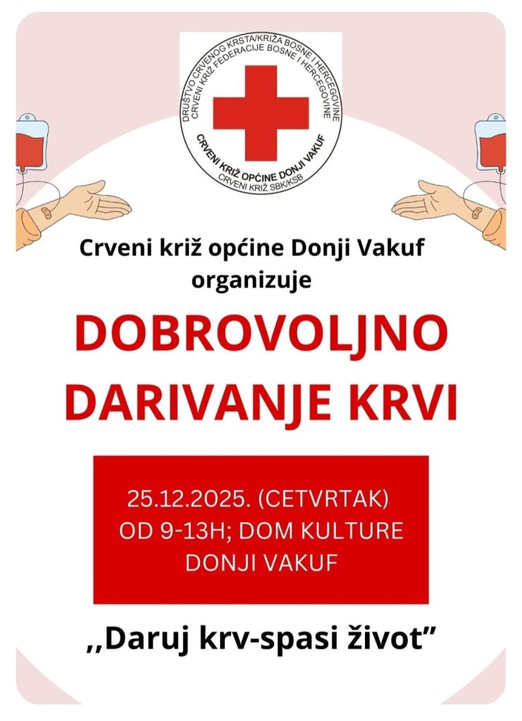Crveni križ Donji Vakuf u četvrtak, 25. decembra 2025. godine organizuje akciju dobrovoljnog darivanja krvi. Ova humana i humanitarna akcija održati će se u Domu kulture Donji Vakuf u vremenu od 9 do 13 sati.