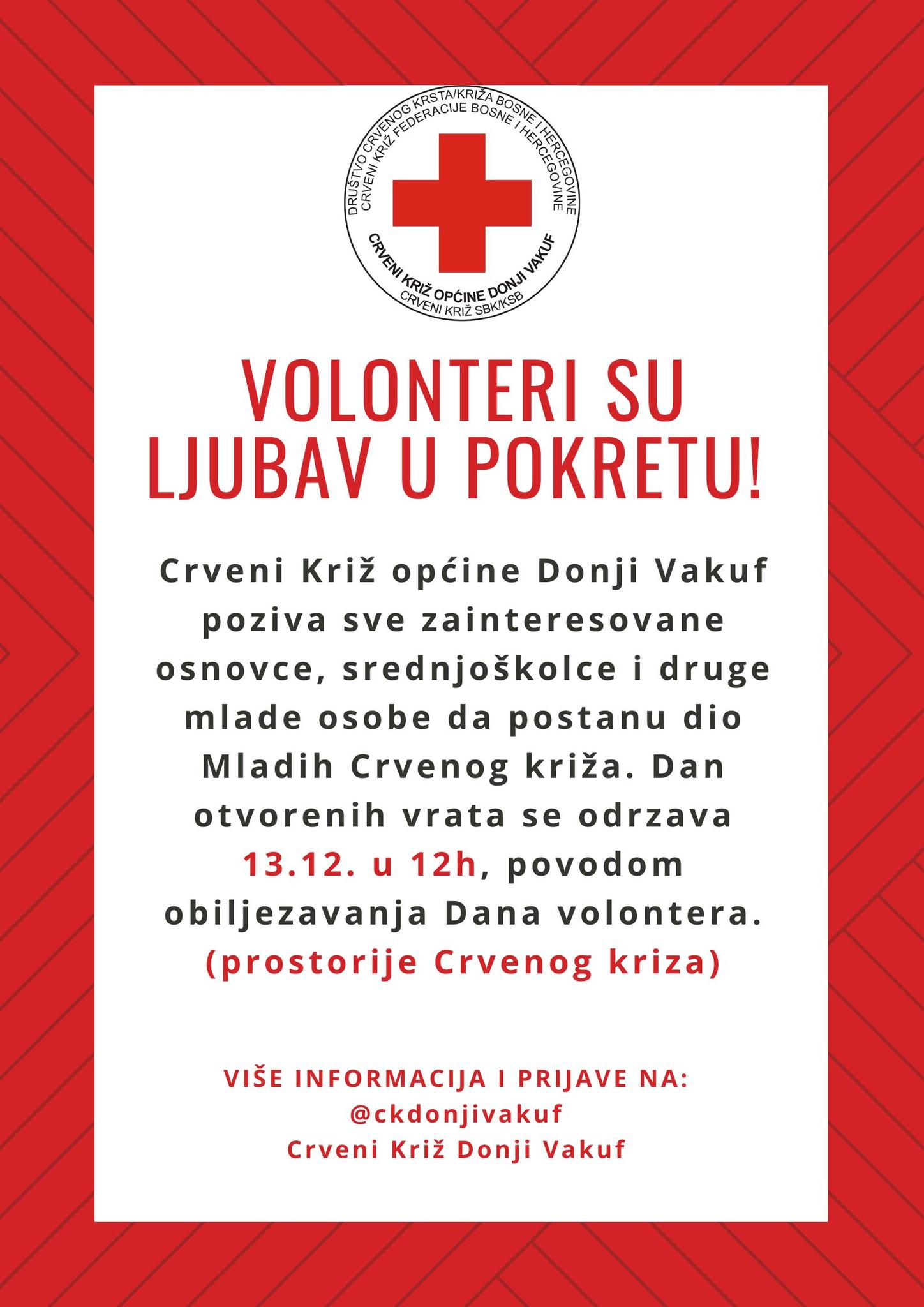 Poseban Dan otvorenih vrata bit će organizovan 12. decembra 2025. godine, kada Crveni križ Donji Vakuf upućuje poseban poziv osnovcima, srednjoškolcima i drugim mladim osobama da se uključe u rad Mladih Crvenog križa.