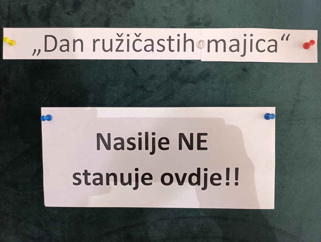 – Članovi kluba su pripremili ružičaste trakice za sve učenike i zaposlenike škole. Također, u holu je postavljen pano na koji su učenici postavljali kartice na kojoj se nalazi parola i poruka (Nasilje NE stanuje ovdje! Ovdje stanuje……………..). Svi učenici škole su pozvani da uzmu učešće u aktivnosti obilježavanja dana prevencije vršnjačkog nasilja, na način da u toku dana stavi ružičastu trakicu na ruku i dopune karticu i istu postave na pano.
