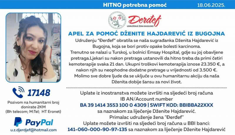 Dženita Hajdarević iz Bugojna bori se s karcinomom i nalazi se na liječenju u Turskoj. Potrebna su velika materijalna sredstva za skupe kemoterapije.