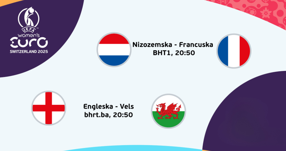 Duel između Engleske i Velsa dostupan je putem EUROVISION SPORT na stranici bhrt.ba; Derbi meč Nizozemska – Francuska bit će direktno prenošen na BHT1, s početkom u 20:50 sati.