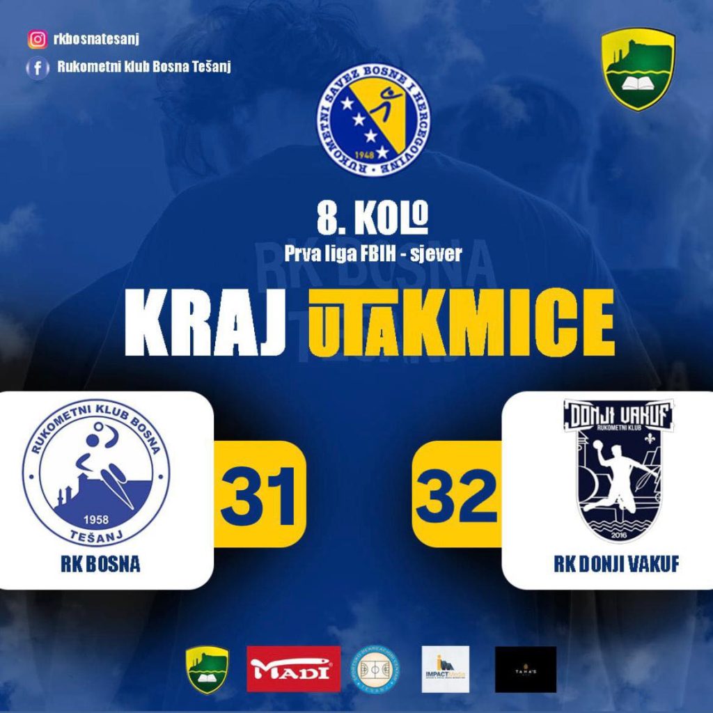 Grčevita borba od samog početka i napetost od prve minute obilježili su rukometni susret domaćina RK”Bosna” Tešanj i gostujuće ekipe RK”Donji Vakuf”. Nakon trijumfa nad ekipom “Čelik” Zenica, donjovakufski rukometaši ostvarili su još jednu pobjedu. Konačan rezultat, do kraja, neizvjesne utakmice, okviru 8.kola Prve rukometne lige FBiH, glasio je: