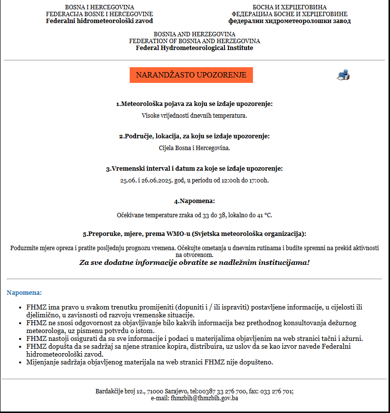 FHMZ: Narandžasto upozorenje zbog visokih dnevnih temperatura