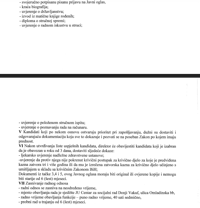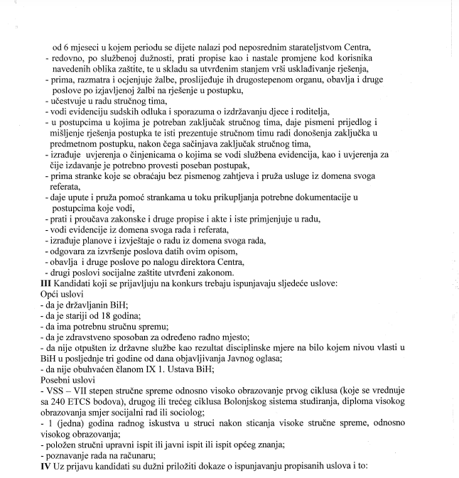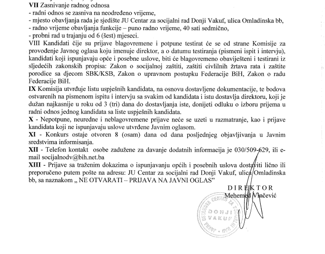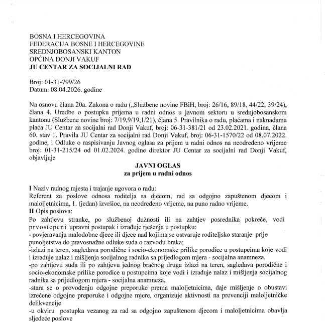 Javni oglas za prijem u radni odnos JU “Centar za socijalni rad” Donji Vakuf