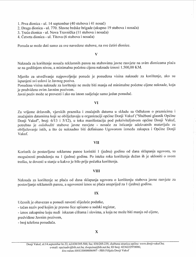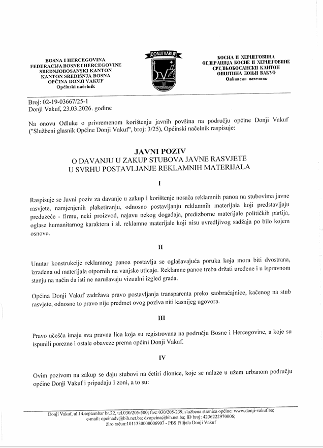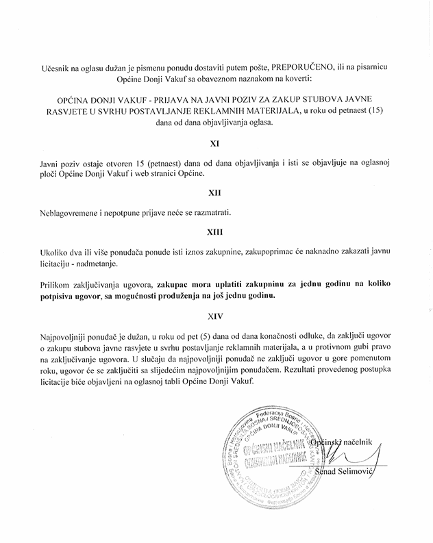JAVNI POZIV o davanju u zakup stubova javne rasvjete u svrhu postavljanje reklamnih materijala