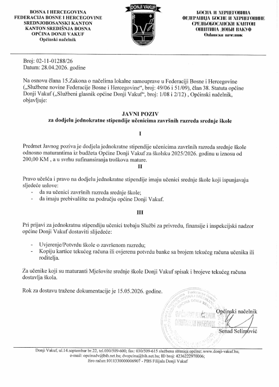 - Kopiju kartice tekućeg računa ili ovjerenu potvrdu banke sa brojem tekućeg računa učenika ili roditelja. Za učenike koji su maturanti Mješovite srednje škole Donji Vakuf spisak i brojeve tekućeg računa dostavlja škola. Rok za dostava tražene dokumenata je 15.05.2026. godine.