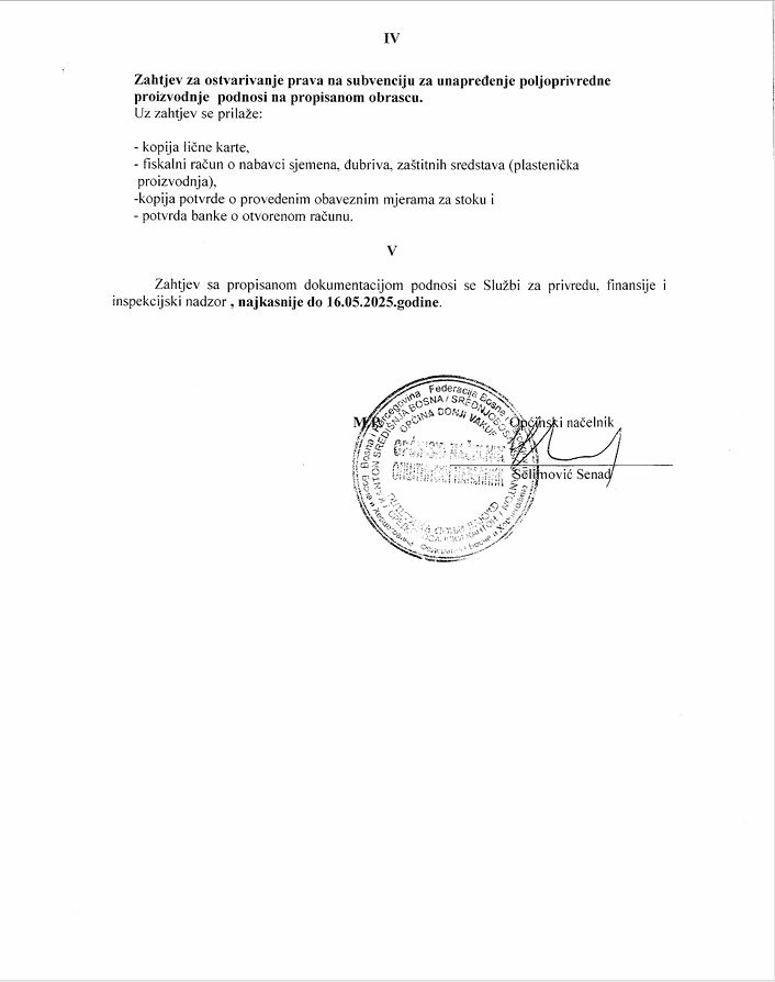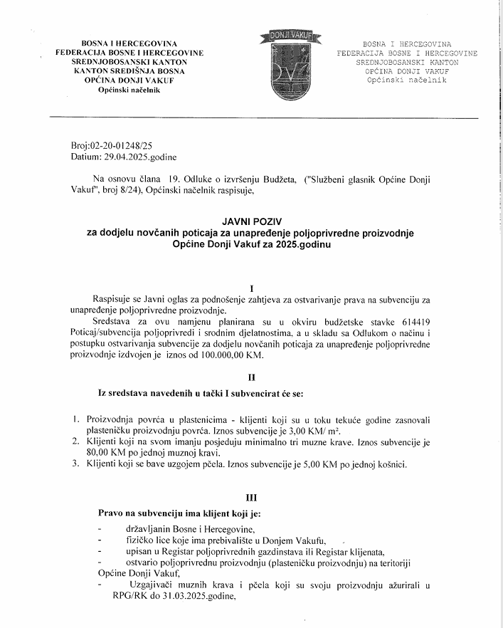 Javni poziv je objavljen na zvaničnoj stranici Općine Donji Vakuf . Isti donosimo u prilogu :