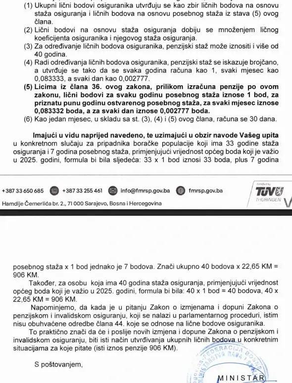 – Za pripadnika boračke populacije koji ima 33 godine staža osiguranja i sedam godina posebnog staža primijenjenujući vrijednost općeg boda koji je važio u 2025. godini, formula bi bila 33 puta 1 bod iznosi 33 boda, plus 7 godina posebnog staža, puta jedan bod, jednako je 7 bodova. Znači, ukupno 40 bodova puta 22,65 KM jeste 906 KM.