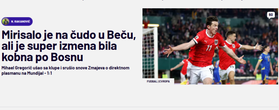 Kada su u pitanju regionalni mediji, može se reći da mnogi žale za tim što je Michael Gregoritsch postigao gol za 1:1 u 77. minuti i tako rastužio cijelu Bosnu i Hercegovinu.