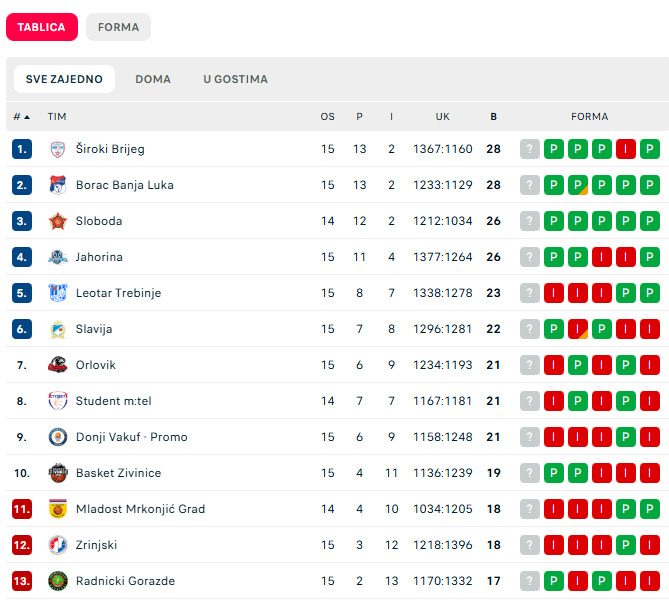 Situacija na tabeli, po pitanju poretka KK Donji Vakuf – Promo je da su naši košarkaši , na 9 poziciji. Do sada su u prvenstvu ostarili 6 pobjeda i 9 izgubljenih utakmica. Ekipa Zrinjski kod koje ove subote gostuju naši košarkaši nalazi se na začelju tabele.
