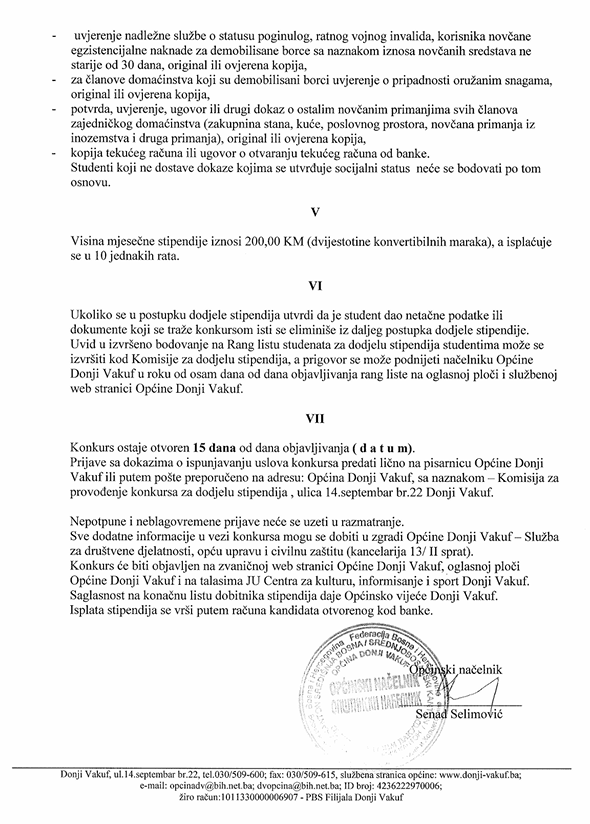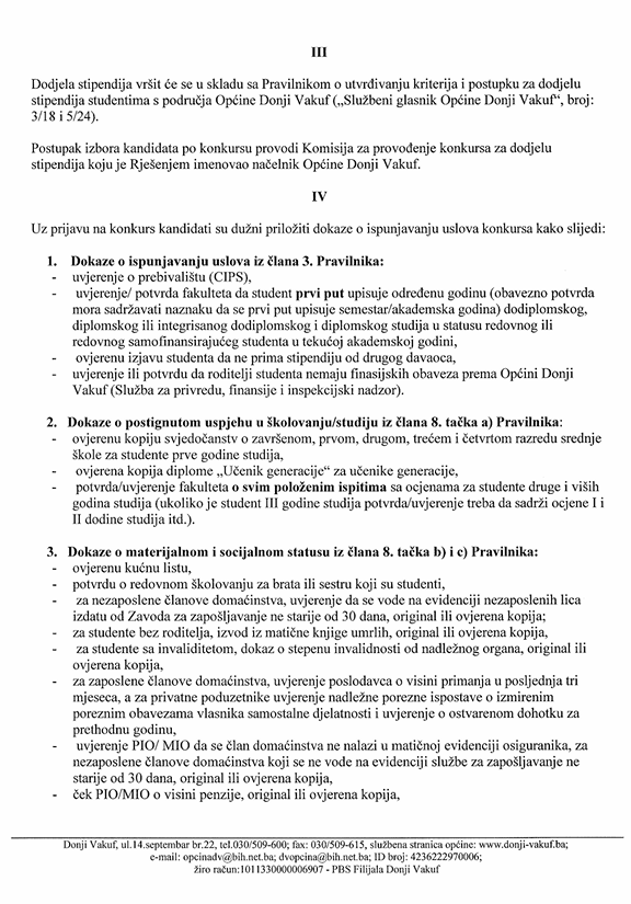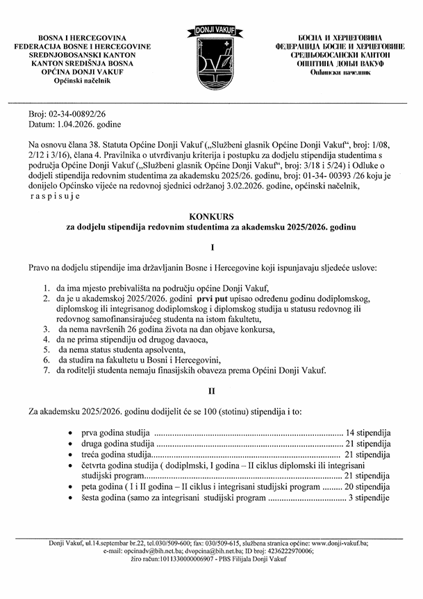 Na osnovu člana 38. Statuta Općine Donji Vakuf,..- člana 4.Pravilnika o utvrđivanja kriterija i postupka za dodjelu stipendija studentima s područja općine Donji Vakuf, Odluku o dodjeli stipendija redovnim studentima za akademsku 2025/26.godinu koju je donijelo Općinsko vijeće na redovnoj sjednici održanoj 3.februara 2026.godine, zajedno s načelnikom općine Donji Vakuf, raspisuje: Konkurs za dodjelu stipendija redovnim studentima za akademsku 2025/26.godinu. Sve dodatne informacije možete pročitati na linku ili – fotografije:
