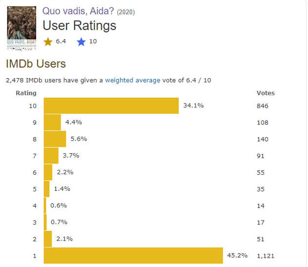 Ovako izgleda trenutna statistika: Film je ocijenilo ukupno 2.478 korisnika, od čega je njih 1.121 (45,2 posto) ostvarenju dalo jednu zvjezdicu, odnosno najnižu ocjenu. S druge strane, najvišom ocjenom film je nagradilo svega 846 glasača (34,1 posto).