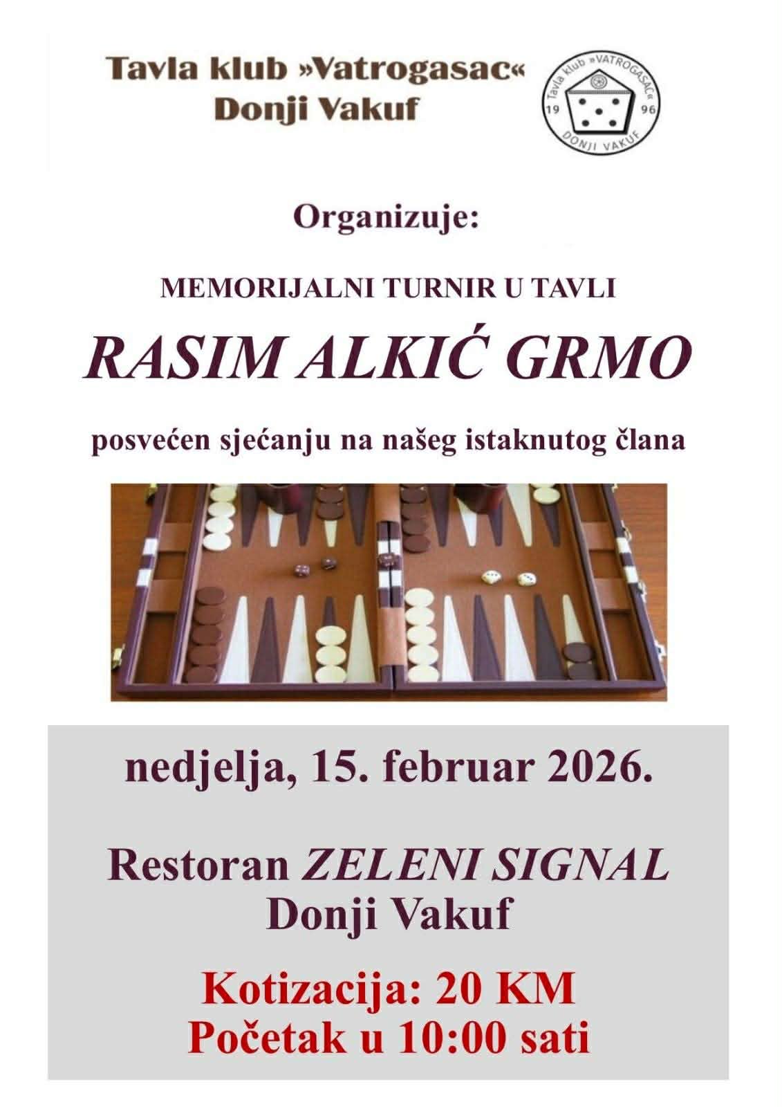 Tavla klub „Vatrogasac“ organizuje Memorijalni turnir „Rasim Alkić Grmo“, koji će se održati sutra, nedjelja, 15. februara 2026. godine, s početkom u 10.00 sati.