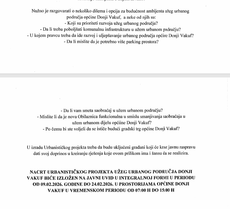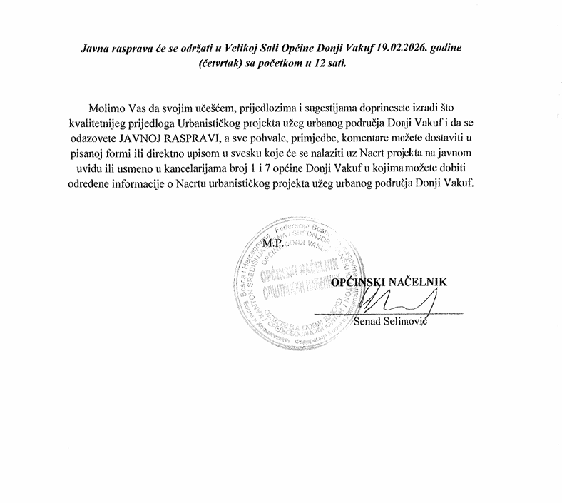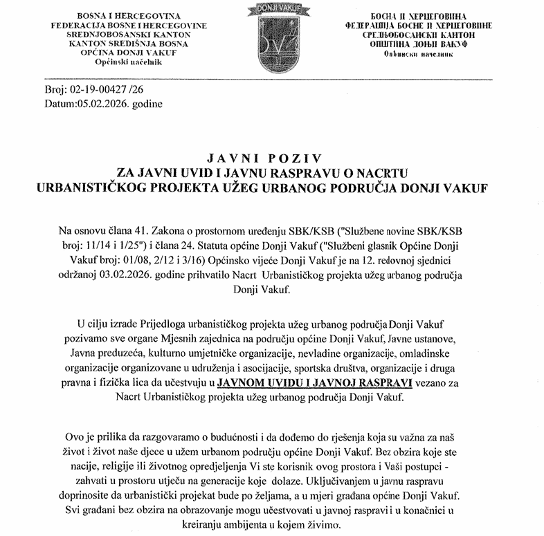U cilju izrade Prijedloga urbanističkog projekta užeg urbanog područja Donji Vakuf iz Općine Donji Vakuf pozivaju sve organe mjesnih zajednica na području općine Donji Vakuf, javne ustanove, javna preduzeća, kulturno umjetničke organizacije, nevladine organizacije, omladinske organizacije organizovane u udruženja i asocijacije, sportska društva, organizacije i druga pravna i fizička lica da učestvuju u JAVNOM UVIDU I JAVNOJ RASPRAVI vezano za Nacrt Urbanističkog projekta užeg urbanog područja Donji Vakuf.