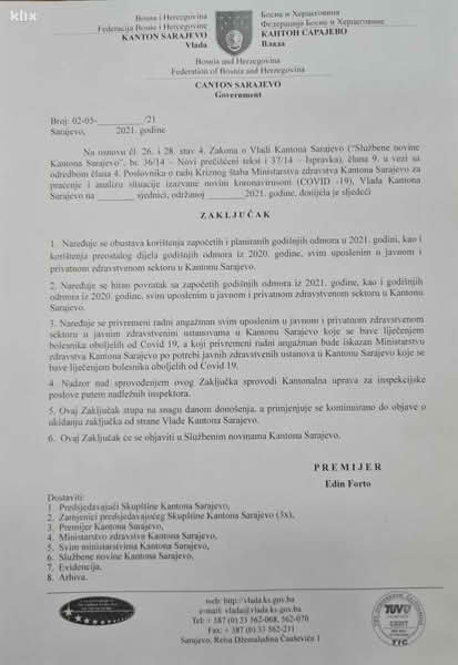 Vlada Kantona Sarajevo danas je donijela nekoliko zaključaka odnosno naredbi zbog teškog epidemiološkog stanja. Većina njih se odnosi na javni i privatni zdravstveni sistem.