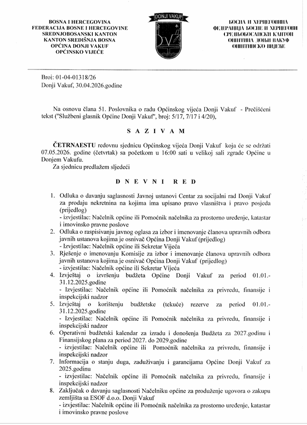 Naredne sedmice zasjeda Općinsko vijeće Donji Vakuf