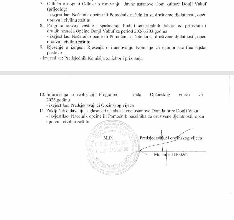 Dvanaesta redovna sjednica Općinskog vijeća Donji Vakuf zakazana je za utorak, 03. februara 2026. godine, s početkom u 16 sati u velikoj sali zgrade Općine Donji Vakuf. Na dnevnom redu 11 tačaka: