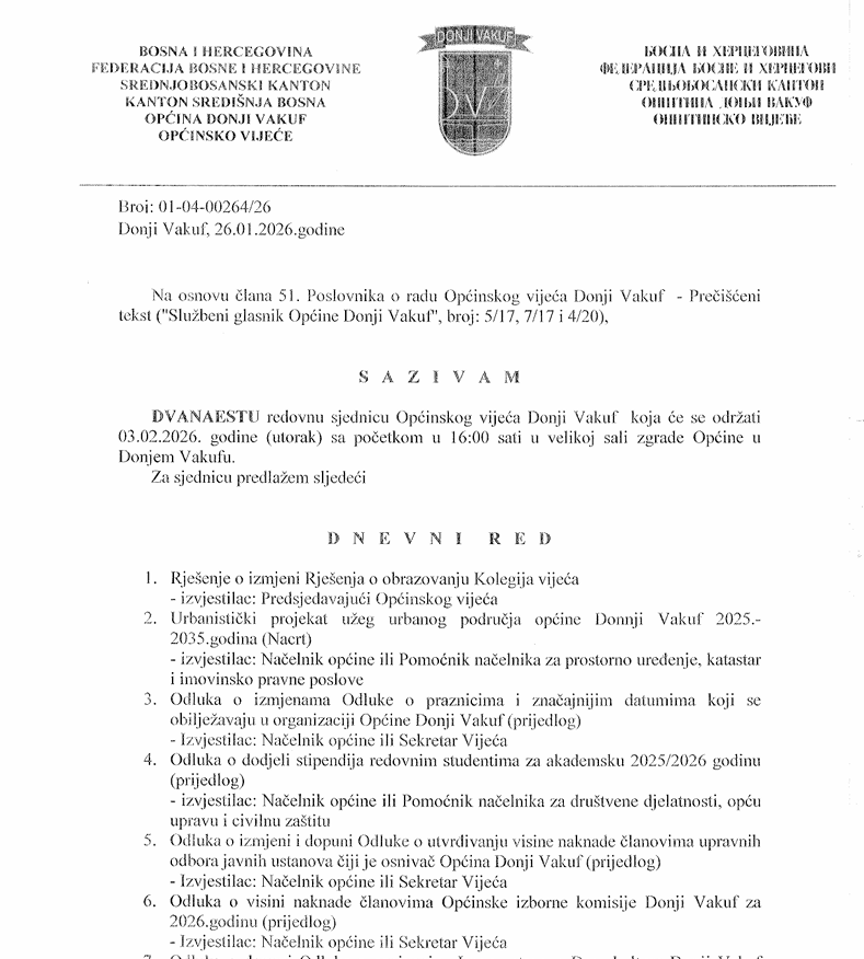 Dvanaesta redovna sjednica Općinskog vijeća Donji Vakuf zakazana je za utorak, 03. februara 2026. godine, s početkom u 16 sati u velikoj sali zgrade Općine Donji Vakuf. Na dnevnom redu 11 tačaka: