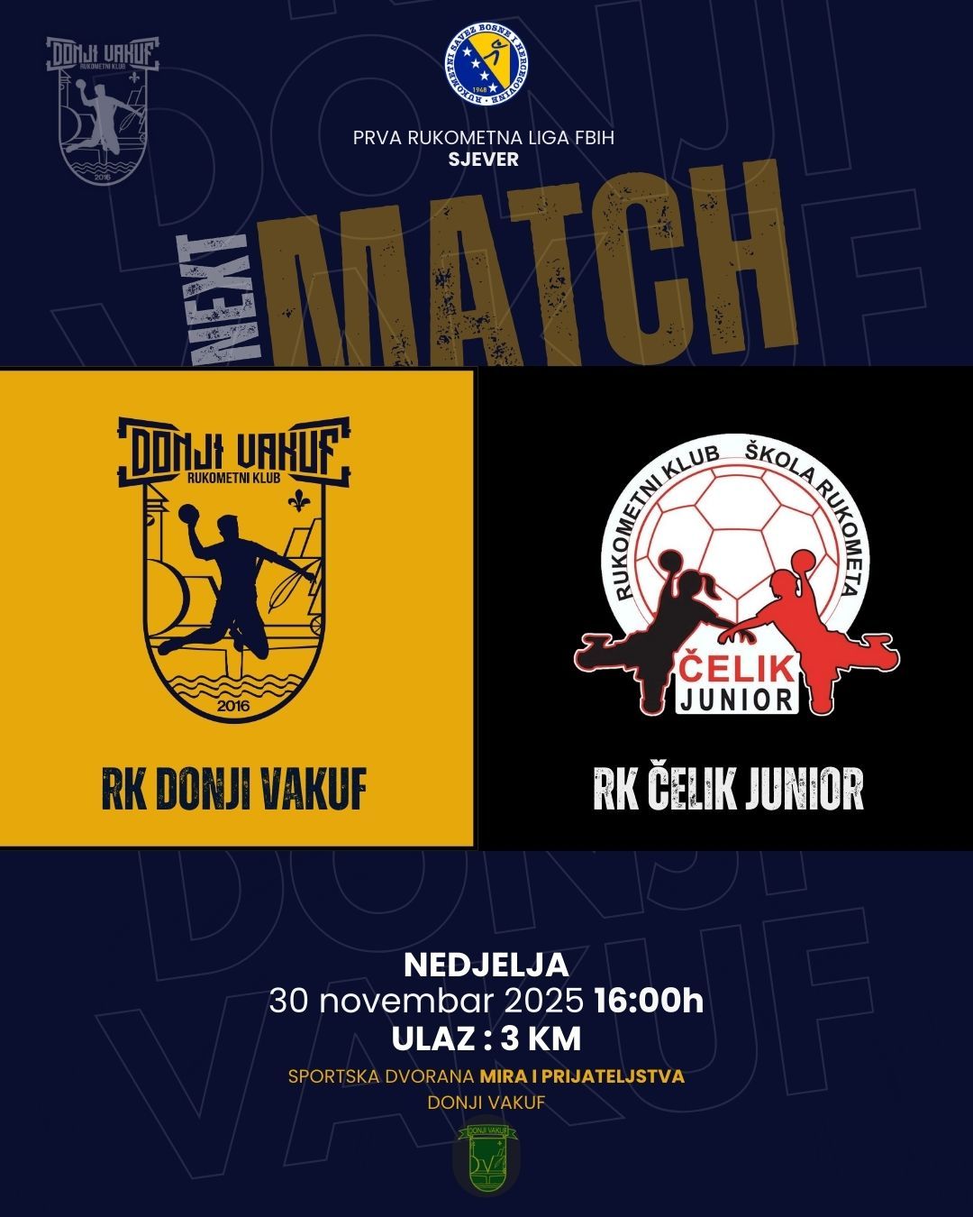 Rukometaši su se u proteklom periodu vrijedno pripremali, a današnji susret prilika je da se njihov trud i zalaganje nagrade dobrom igrom i pozitivnim rezultatom. Ove sedmice u Donji Vakuf dolaze gosti iz Zenice – ekipa RK Čelik Junior Zenica. Atmosfera je iz utakmice u utakmicu sve bolja, ekipa igra borbeno i odlučno, a tribine ponovo postaju naš najjači vjetar u leđa.