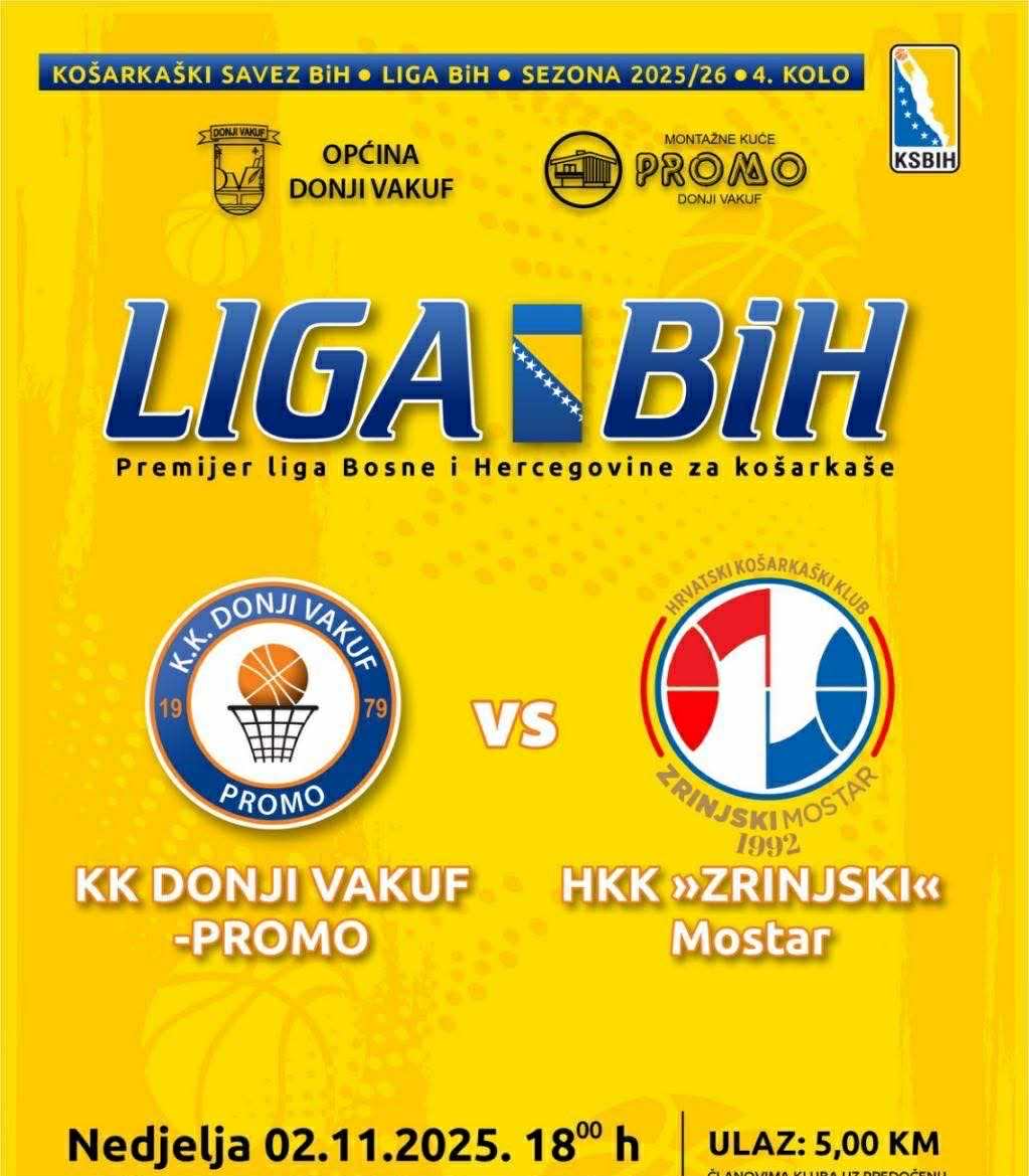 - Košarkaški susret KK “Donji Vakuf – Promo” ugostit će ekipu HKK “Zrinjski” Mostar. Utakmica, koja počinje u 18.00 sati u Sportskoj dvorani u Donjem Vakufu, bit će prilika da domaći tim odmjeri snage s povratnicima u društvo najboljih.