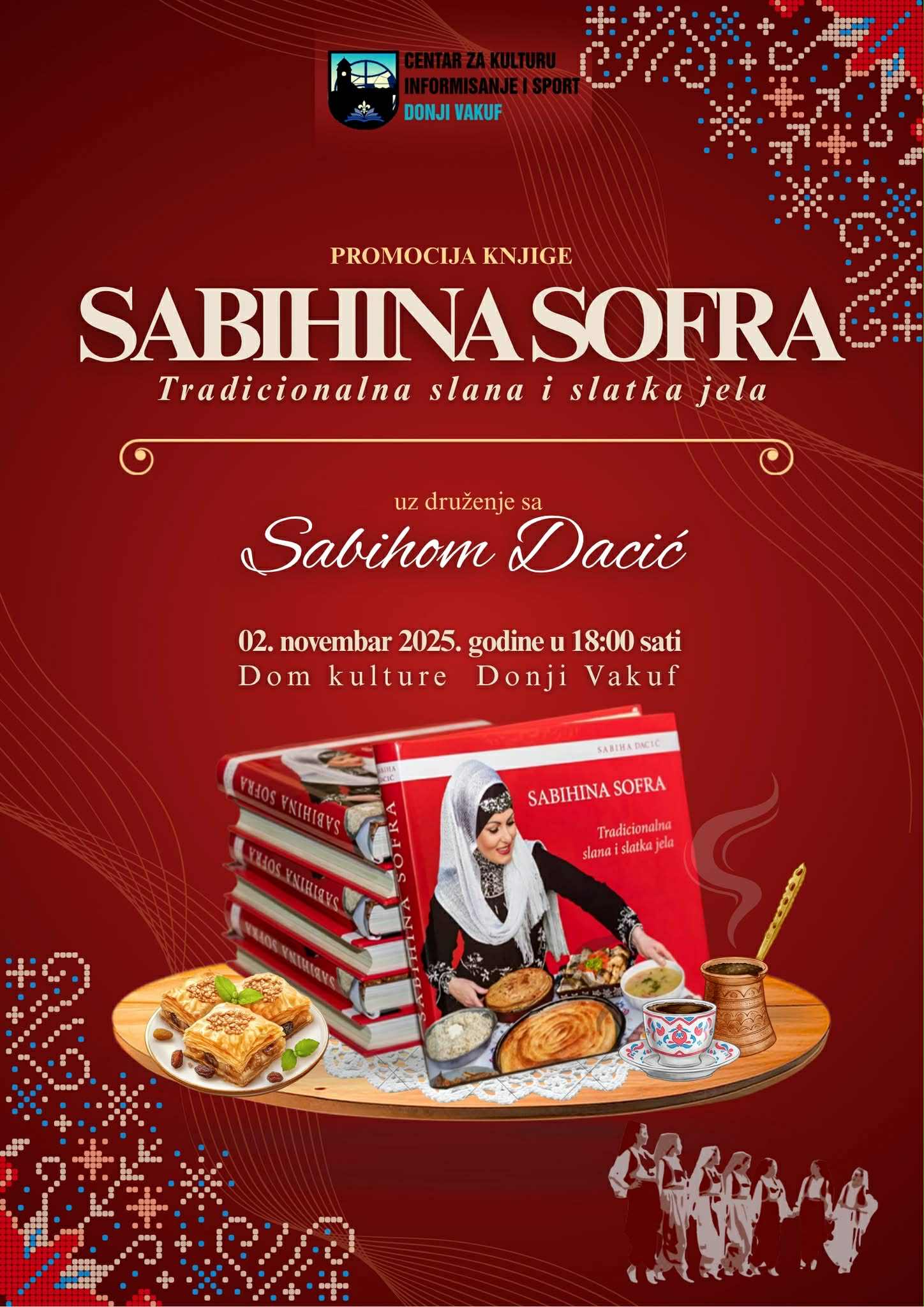 - Promocija knjige – JU Centar za kulturu, informisanje i sport Donji Vakuf, organizira promociju knjige “Sabihina sofra” autorice Sabihe Dacić. Događaj počinje u 18.00 sati u objektu Doma kulture, a posjetioci će moći uživati u druženju s autoricom, degustaciji tradicionalnih bosanskih jela i nastupu rekreativne ženske folklorne grupe.