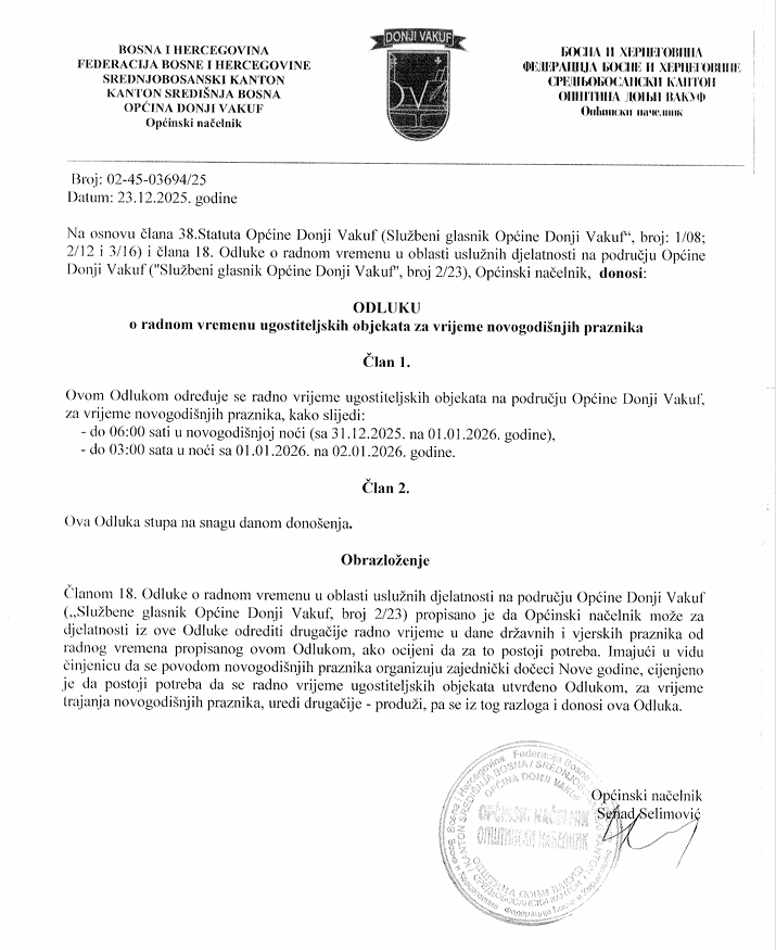OPĆINA DONJI VAKUF – Odluka o radnom vremenu ugostiteljskih objekata za vrijeme novogodišnjih praznika