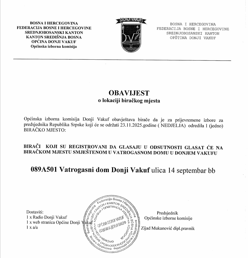Općinska izborna komisija Donji Vakuf: Obavijest o lokaciji biračkog mjesta za prijevremene izbore za predsjednika RS