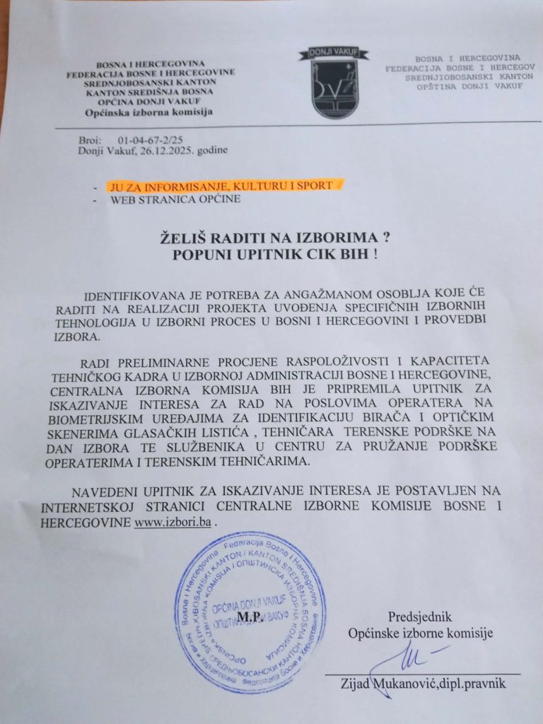 Općinska izborna komisija – Želiš raditi na izborima? Popuni upitnik CIK BiH!