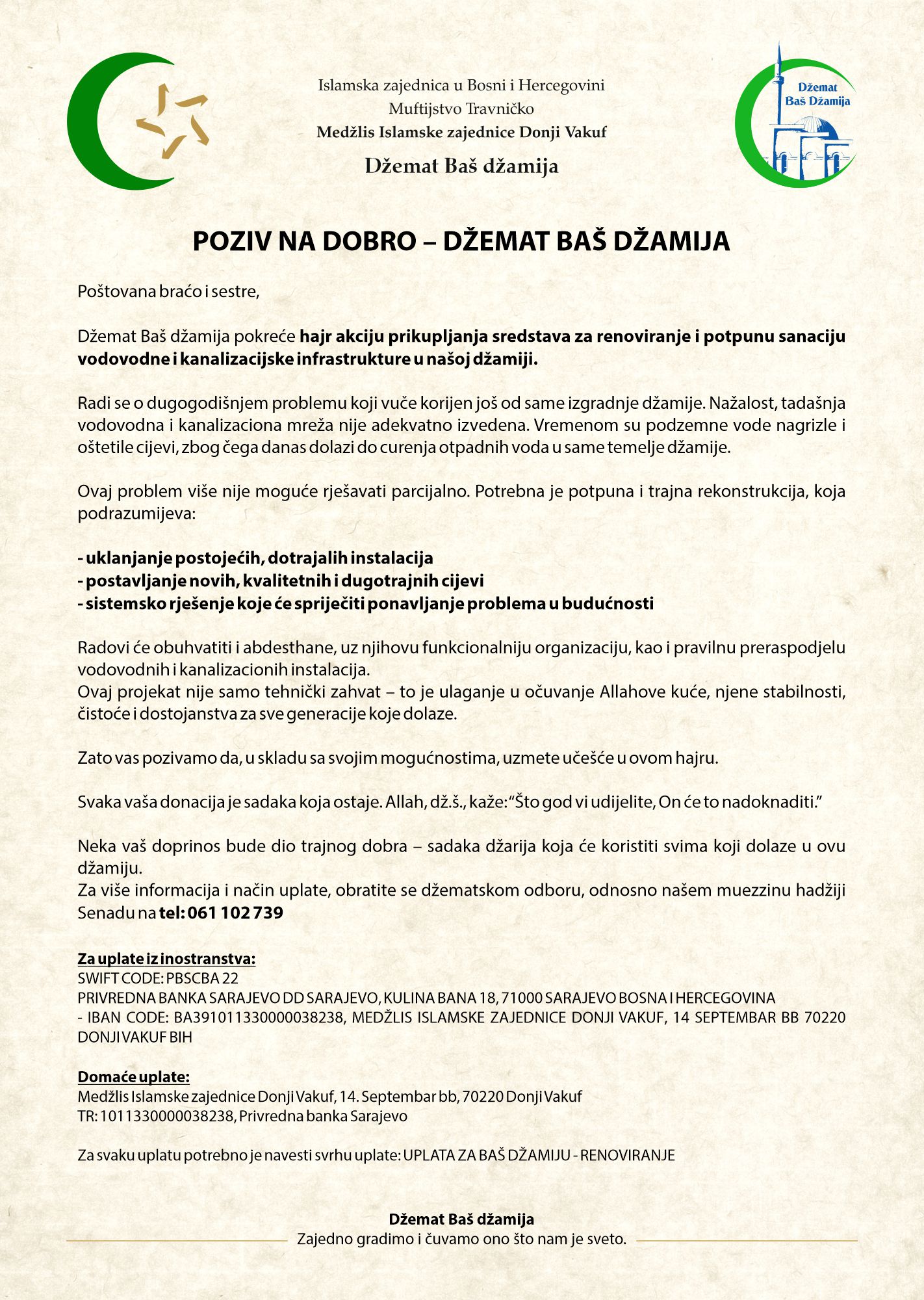 Za svaku uplatu potrebno je navesti svrhu uplate: UPLATA ZA BAŠ DŽAMIJU – RENOVIRANJE