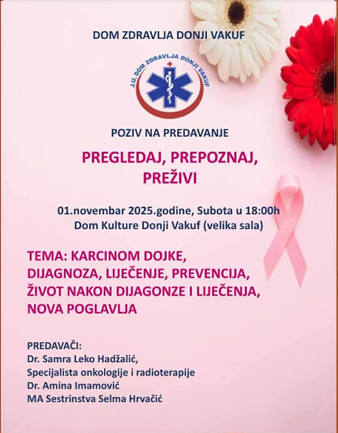 Večeras, s početkom od 18.00 sati, u prostoriji Doma kulture (velika sala), bit će upriličeno predavanje za sve žene na temu: “Karcinom dojke, dijagnoza, liječenje, prevencija, život nakon dijagnoze i liječenja, nova poglavlja” – s predavačima: dr. Samra Leko Hadžalić, po zanimanju, “Specijalista onkologije i radioterapije, dr.Amina Imamović, magistar sestrinstva – Selma Hrvačić. Pozivamo sve žene da svojim prisustvom pokažu da im je stalo do edukativnog pristupa koji se odnosi na njihovo, ali i na zdravlje svih žena.