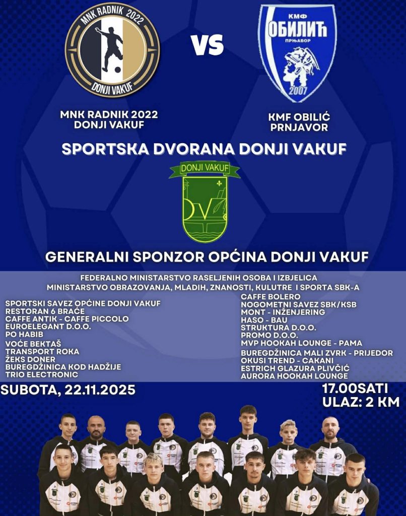 U okviru premijer U 19 futsal Lige u subotu, 22.11.2025. u 17:00, omladinci MNK”Radnik 2022”Donji Vakuf dočekuju ekipu KMF Obilić Prnjavor.