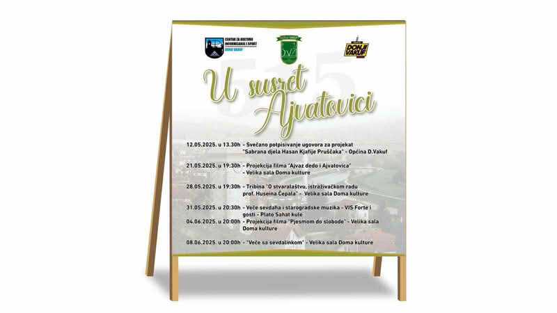 - Koncertom sevdaha i Velikoj sali Doma kulture Donji Vakuf u nedjelju, 08. juna 2025. godine od 20.00 sati, okončat će se manifestacija ” U susretu Ajvatovici”.