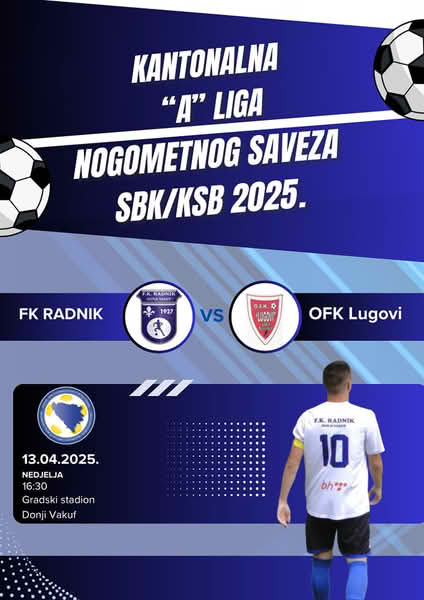 Prvi tim FK Radnik Donji Vakuf, u nedjelju na Gradskom stadionu u Donjem Vakufu u okviru Kantonalne „A“ lige dočekuje ekipu Omladinskog fudbalskog kluba Lugovi iz Busovače. Utakmica se igra u nedjelju, 13. aprila od 16.30 minuta.