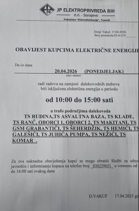Zbog radova na zamjeni dalekovodnih stubova u ponz, 20. aprila biti će isključena električna energija u vremenskom periodu od 10:00 do 15:00 sati u trafo područjima dalekovoda: