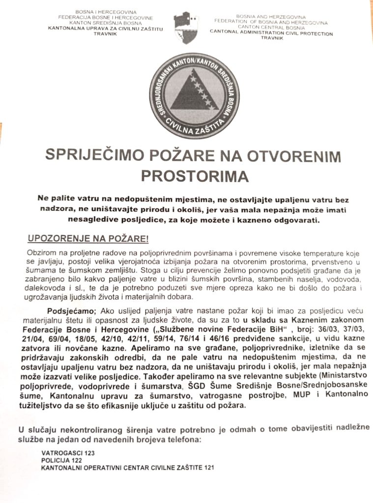 Obzirom na proljetne radove na poljoprivrednim površinama i povremene visoke temperature koje se javljaju, postoji velika vjerojatnoća izbijanja požara na otvorenim prostorima, prvenstveno u šumama te šumskom zemljištu. Stoga u cilju prevencije želimo ponovno podsjetiti građane da je zabranjeno bilo kakvo paljenje vatre u blizini šumskih površina, stambenih naselja, vodovoda, dalekovoda i sl., te da je potrebno poduzeti sve mjere opreza kako ne bi došlo do požara i ugrožavanja ljudskih života i materijalnih dobara. Podsjećamo; Ako uslijed paljenja vatre nastane požar koji bi imao za posljedicu veću materijalnu štetu ili opasnost za ljudske živote, da su za to u skladu sa Kaznenim zakonom Federacije Bosne i Hercegovine („Službene novine Federacije BiH”, broj: 36/03, 37/03, 21/04, 69/04, 18/05, 42/10, 42/11, 59/14, 76/14 i 46/16 predviđene sankcije, u vidu kazne zatvora ili novčane kazne. Apeliramo na sve građane, poljoprivrednike, izletnike da se pridržavaju zakonskih odredbi, da ne pale vatru na nedopuštenim mjestima, da ne ostavljaju upaljenu vatru bez nadzora, da ne uništavaju prirodu i okoliš, jer mala nepažnja može izazvati velike posljedice. Također apeliramo na sve relevantne subjekte (Ministarstvo poljoprivrede, vodoprivrede i šumarstva, ŠGD Šume Središnje Bosne/Srednjobosanske šume, Kantonalnu upravu za šumarstvo, vatrogasne postrojbe, MUP i Kantonalno tužiteljstvo da se što efikasnije uključe u zaštitu od požara.