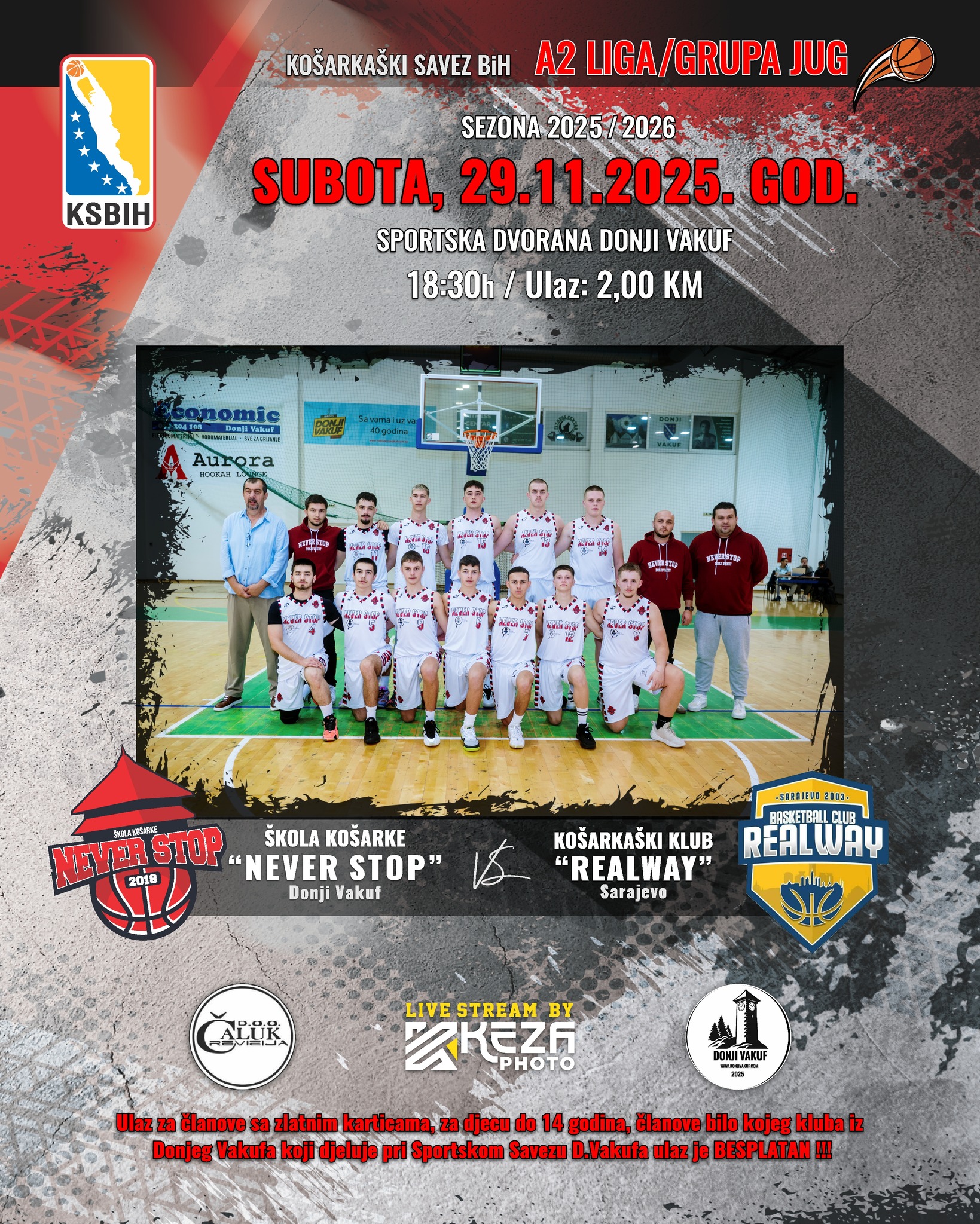 Seniori ŠK „Never Stop“ sutra, 29. novembra  na domaćem terenu, u okviru redovnog kola A2 lige Košarkaškog saveza BiH , grupa Jug  ugostit će ekipu KK „Realway“ Sarajevo. Utakmica se igra od 18:30 sati u Sportskoj dvorani Donji Vakuf.