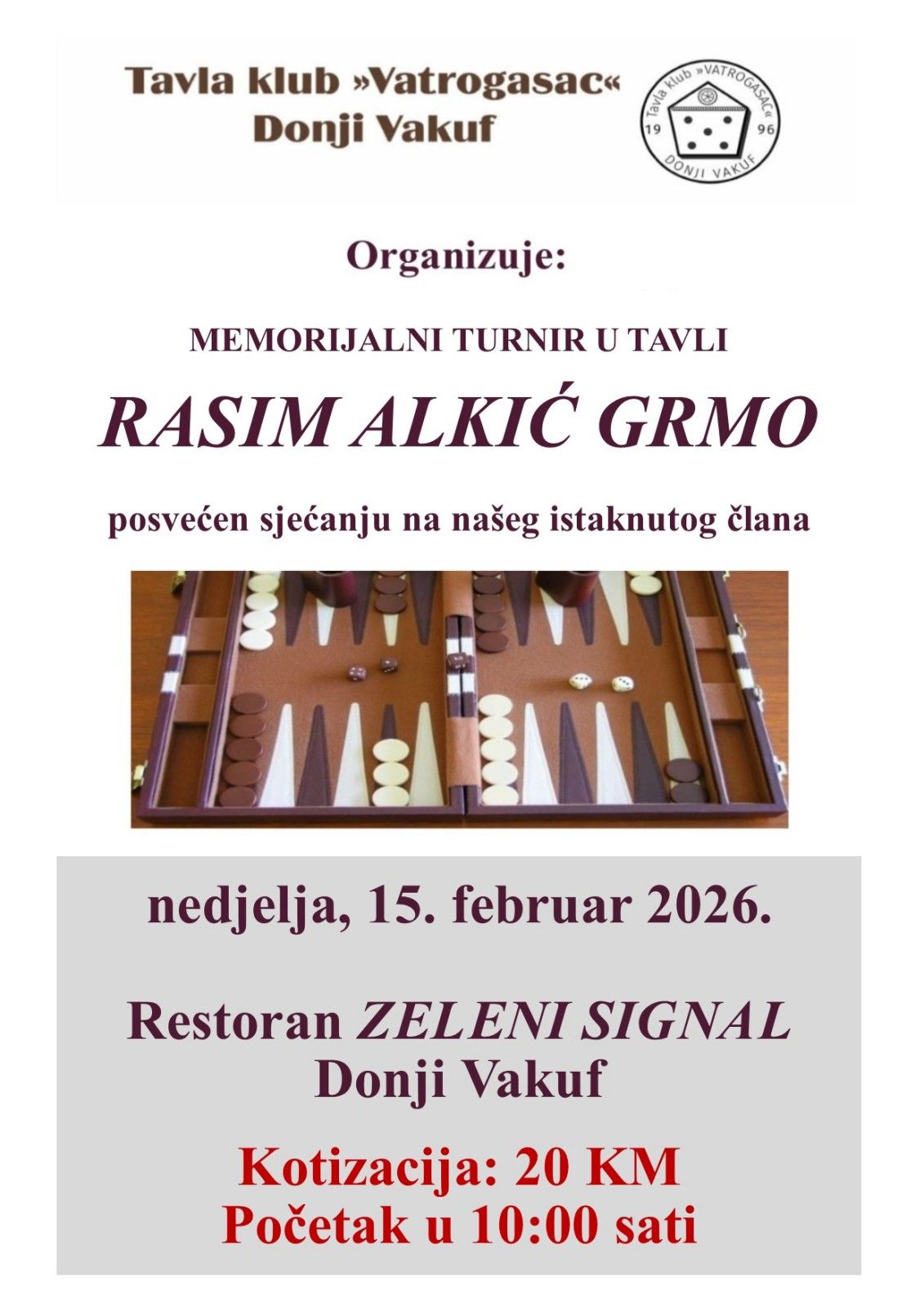 Kako najavljuju organizatori turnira, isti će se održati u nedjelju, 15. februara u prostorijama restorana Zeleni signal .