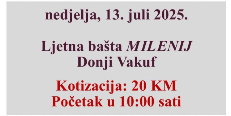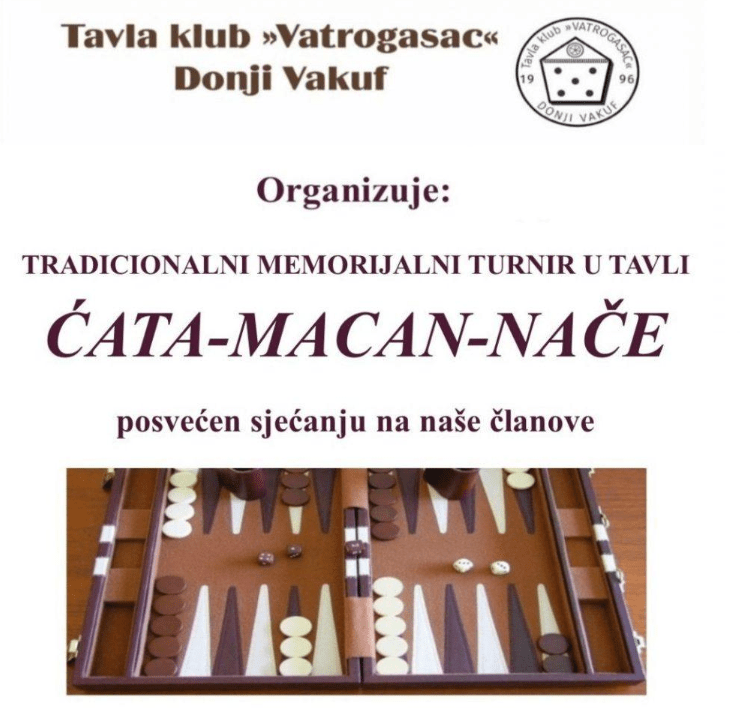 Tavla klub ”Vatrogasac” Donji Vakuf danas organizuje tradicionalni memorijalni turnir u tavli “Ćata – Macan – Nače.” Turnir se održava u znak sjećanja na preminule članove kluba. Takmičenje počinje danas, 13. jula 2025. godine, u 10.00 sati – Ljetna bašta MILENIJ Donji Vakuf – Kotizacija 20 KM.