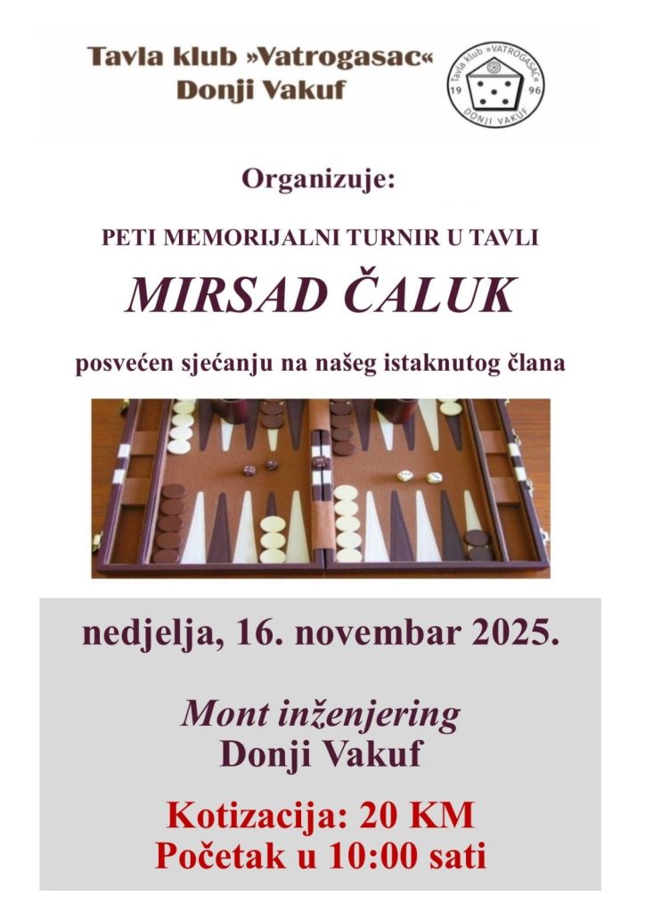 Tavla klub “Vatrogasac” Donji Vakuf organizuje Peti memorijalni turnir u tavli “Mirsad Čaluk” u znak sjećanja na istaknutog člana Kluba “Vatrogasac”.