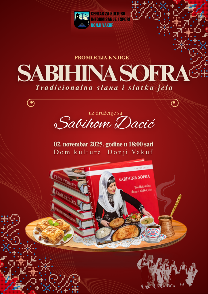 Promocija knjige “Sabihina sofra” Sabihe Dacić, u organizaciji JU Centar za kulturu, informisanje i sport Donji Vakuf, bit će upriličeni u nedjelju, 02. novembra od 18 sati u objektu Doma kulture. Uz promociju knjige i druženje sa autoricom posjetioci će imati priliku uživati u degustaciji slatkih i slavnih jela tradicionalne bosanske kuhinje i nastupu rekreativne ženske grupe folklora.