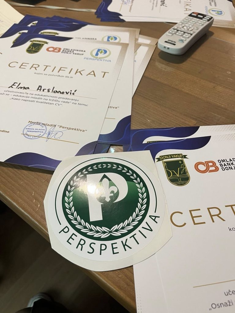 Predavanje je realizovano u saradnji Općine Donji Vakuf, Omladinske banke i Mreže mladih Perspektiva, s ciljem osnaživanja mladih osoba kroz sticanje praktičnih znanja i vještina neophodnih za uspješan ulazak na tržište rada. Tokom edukacije učesnici su imali priliku da se upoznaju s osnovnim elementima profesionalnog CV-ja, najčešćim greškama prilikom pisanja biografije, kao i savjetima kako na jasan, pregledan i autentičan način predstaviti svoje znanje, iskustvo i kompetencije potencijalnim poslodavcima.