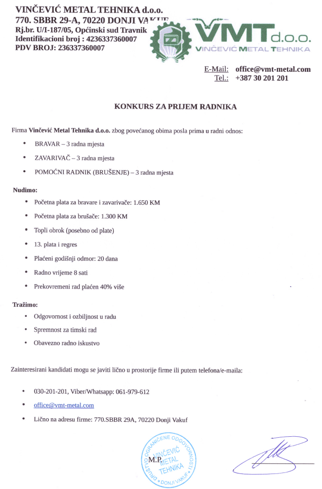 “Vinčević Metal tehnika d.o.o. Donji Vakuf – raspisuje konkurs za prijem radnika”
