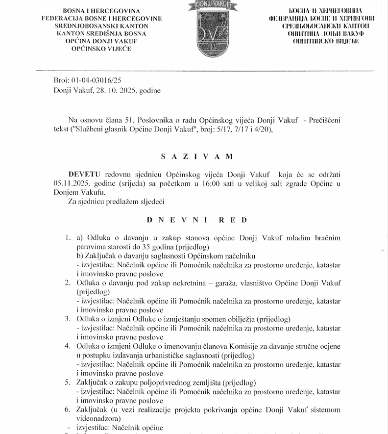 Deveta redovna sjednica Općinskog vijeća Donji Vakuf zakazana je za srijedu, 05.11.2025. godine.
