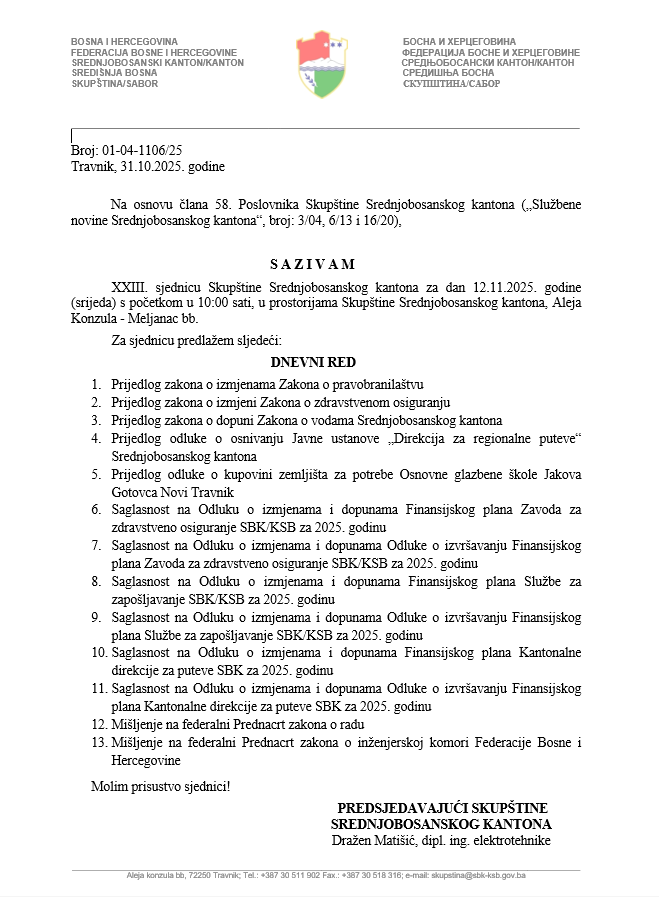 Dvadesettreća sjednica Skupštine Srednjobosanskog kantona zakazana je za 12. novembar 2025. godine.