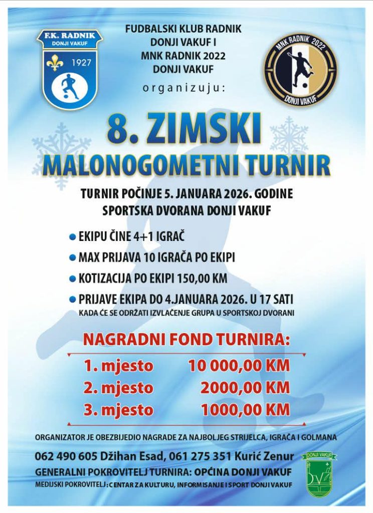 FK “Radnik” i MNK “Radnik 2022” organizuju 8. Zimski malonogometni turnir koji počinje 5. januara 2026. godine. Generalni pokrovitelj turnira je Općina Donji Vakuf a medijski pokrovitelj JU Centar za kulturu, informisanje i sport Donji Vakuf. Turnir će se tradicionalno odigravati u Sportskoj dvorani Donji Vakuf. Nagradni fond turnira je 13.000 KM, nagrada za prvo mjesto 10.000 KM, 2. mjesto 2.000 KM i 3. mjesto 1.000 KM. Ekipe se mogu prijaviti do 4. januara kad će biti organizovano izvlačenje grupa.